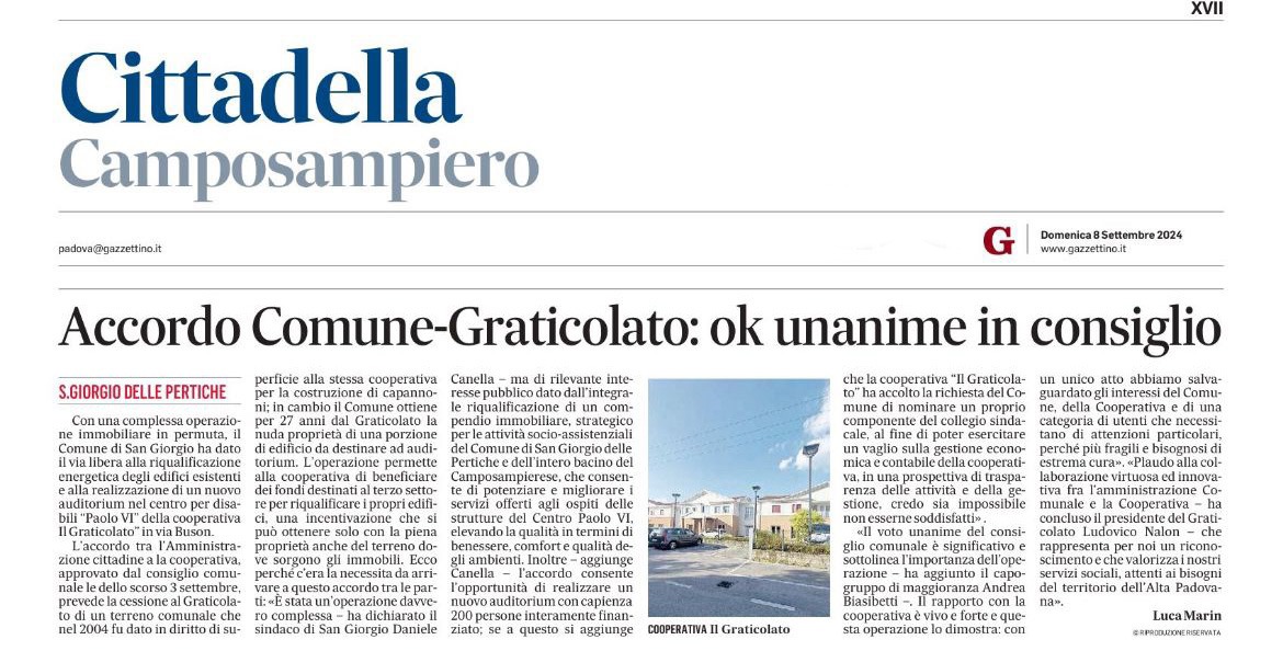 Accordo Comune – Graticolato Il Mattino di Padova del 8 settembre 2024 Condividi Scopri altri Articoli Inclusione e Lavoro: Nuove Opportunità a Camposampiero Dicono di Noi / 17 Gennaio 2024 Disabilità e Lavoro Dicono di Noi / 22 Dicembre 2024 Permuta tra Comune e Coop Dicono di Noi / 5 Settembre 2024